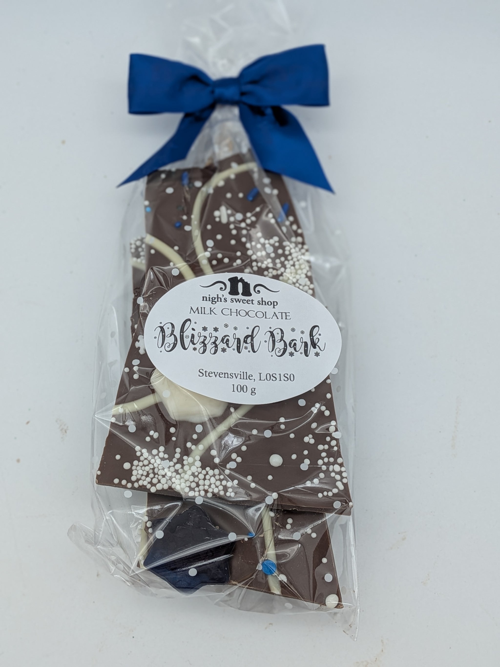 – Sold OutTake a bite out of winter! 100g Rich milk chocolate bark drizzled with ivory chocolate and sprinkled with gummi snowflakes