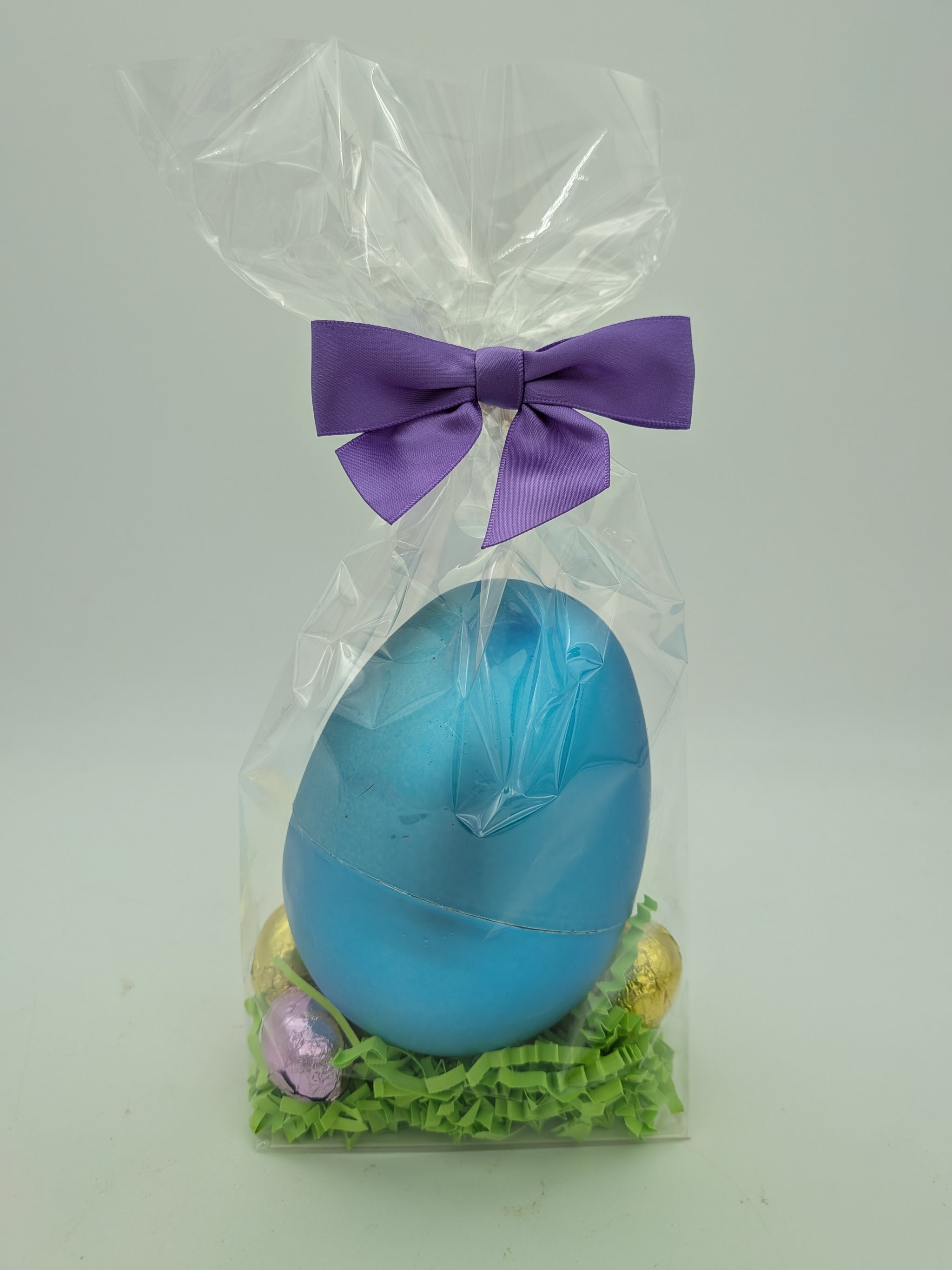 Cute, solid milk chocolate bunny hiding in a large Easter egg with Easter salt water taffy and milk chocolate foil eggs.