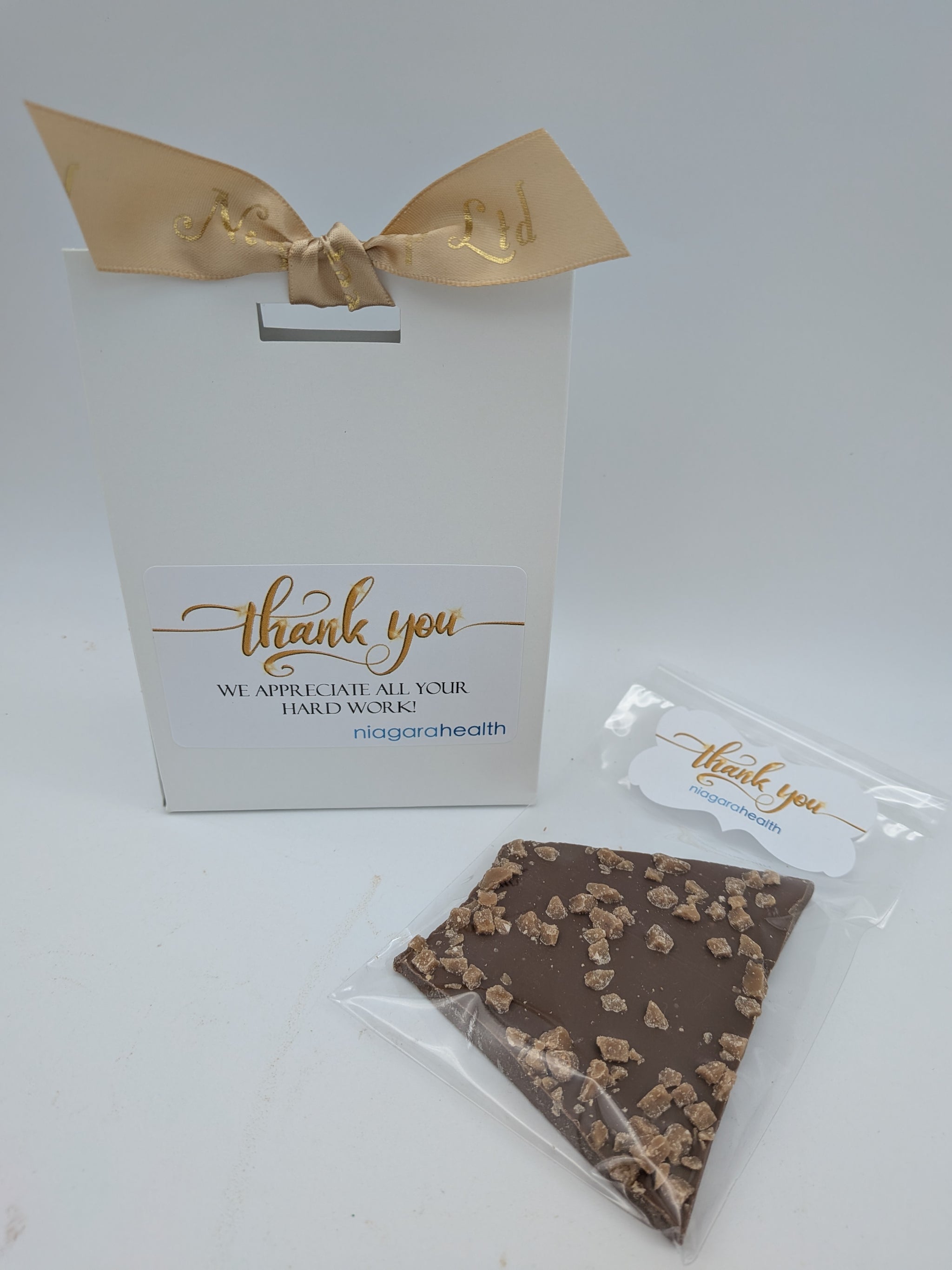 - 30g chocolate bark (butterscotch crunch, sea salt, or triple chocolate) with thank you label