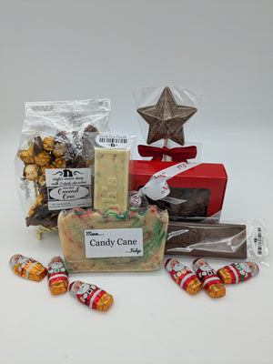 – Sold OutA festive gift for chocolate lovers all around! Includes 100g box of milk chocolate candy canes, snack sized chocolate-drizzled caramel corn, a 200g slice of holiday flavoured old fashioned fudge, a milk chocolate hand-painted Christmas star sucker, a double truffle gourmet hot chocolate, a sample package of Jelly Belly Jellybeans, a stick of old fashioned rock candy, and a sprinkle of peppermint twist candies.