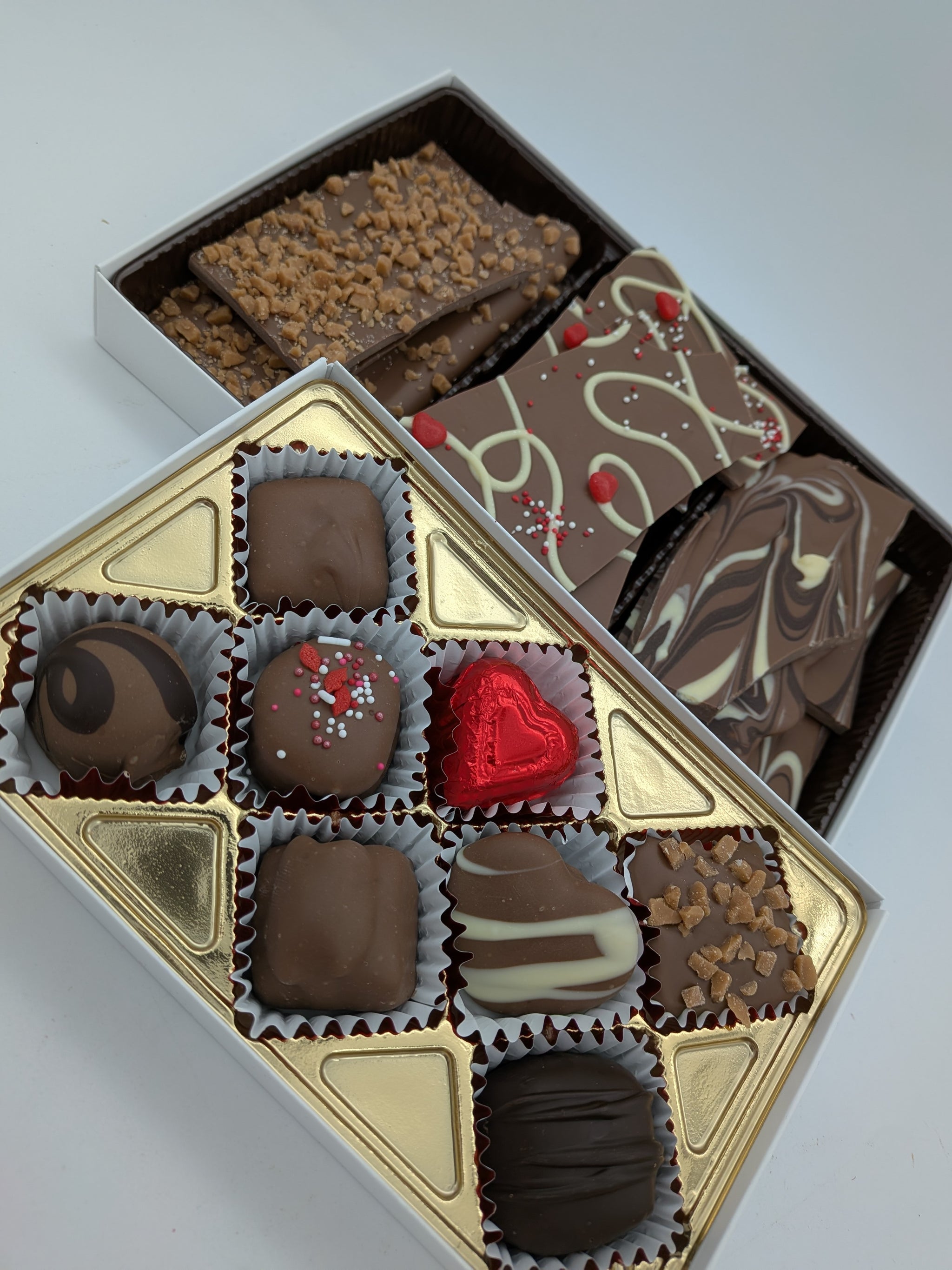 A perfect Valentine's gift for those chocolate lovers that like to have a taste of everything! Includes 400g box of assorted chocolate bark and a sampler box of premium chocolates.